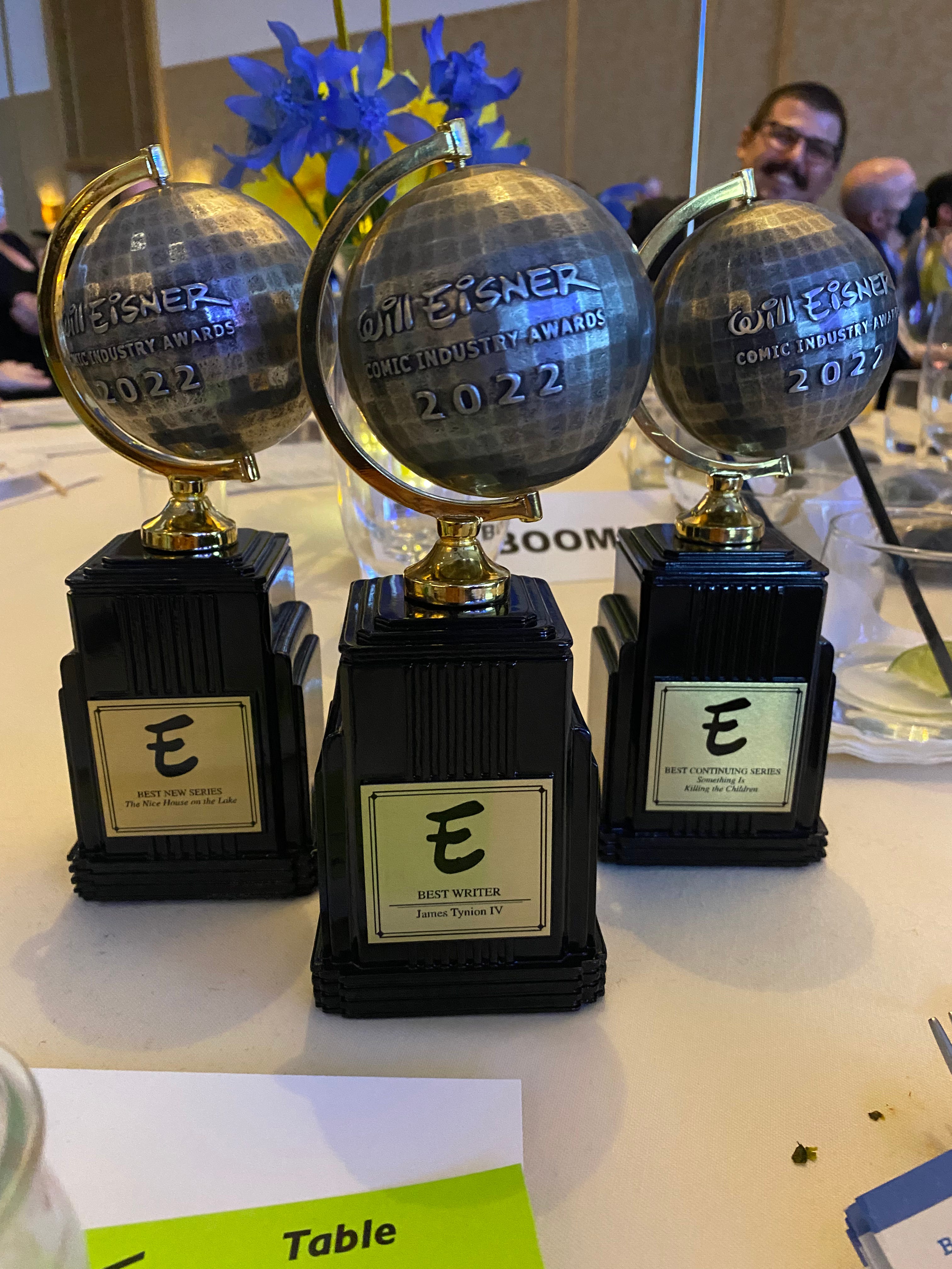 I’m hugely proud of the teams on SOMETHING IS KILLING THE CHILDREN and THE NICE HOUSE ON THE LAKE, and it was a thrill to be able to message Werther and Alvaro the good news right as they were waking up on the other side of the world. I’m also hugely proud of my creative teams on the two nominated books that didn’t take home the trophy - WYND and THE DEPARTMENT OF TRUTH. I’m still so fucking honored and gratified to have my big four titles nominated in the same year. I also need to give a shout out to my amazing friend and mentor, Scott Snyder, who besides from being the person who brought me into this incredible night, helped rescue me from the bar afterwards to go outside and decompress a bit and recenter enough to enjoy the rest of the evening.